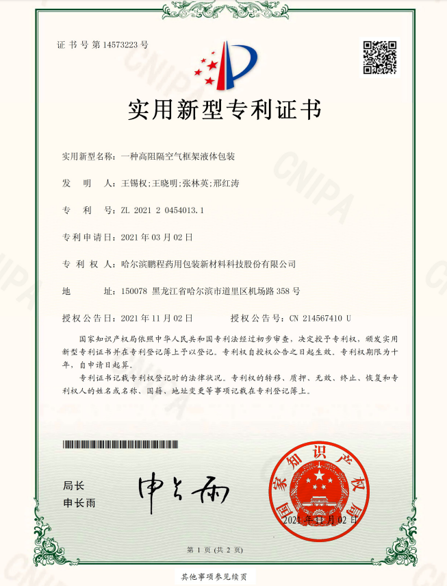 專利 權 人:哈爾濱鵬程藥用包裝新材料科技股份有限公司