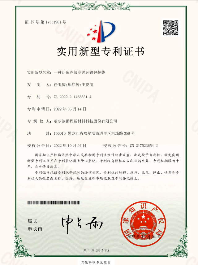 實用新型名稱:一種活魚充氧高強運輸包裝袋